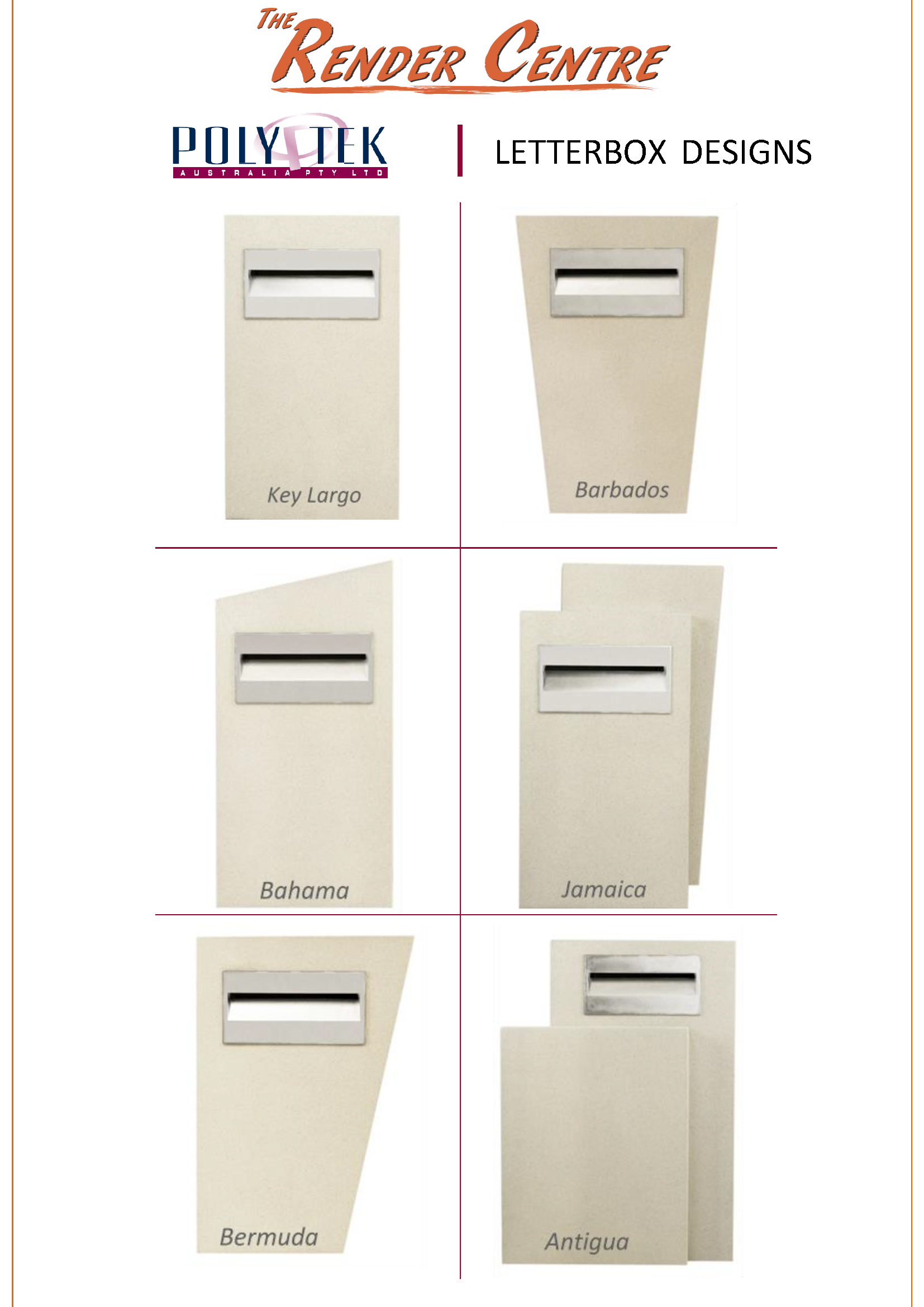 Poly-Tek Letterboxes are available at The Render Centre in several different designs to suit your home. The Poly-Tek Letterboxes are manufactured using a high density lightweight core with a Hard Coat and sand textured finish. The application of this coating provides a superior strength along with stylish modern ‘rendered’ aesthetics. Each letterbox includes a 50mm galvanised RHS steel post for ultimate footing strength and ease of installation.
